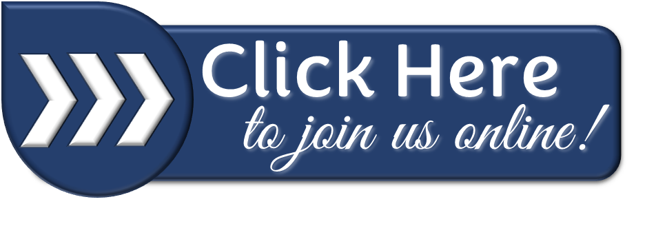 Blue online invitation button with white text saying 'Click Here to join us online!' and three white arrows pointing right.
